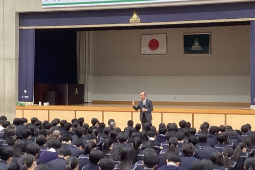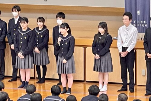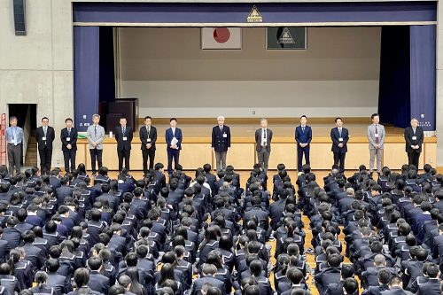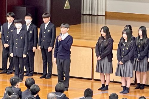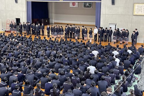 まず、全校生徒に対して、校長先生から管理職や部長の先生方の紹介がありました。